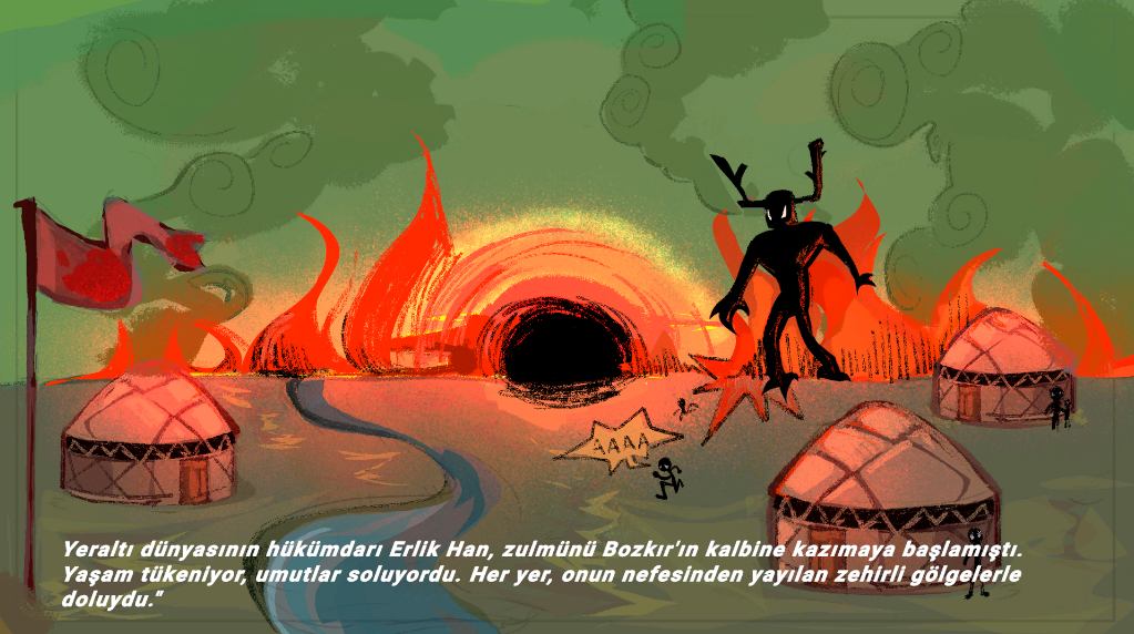 Yeraltı dünyasının hükümdarı Erlik Han, zulmünü Bozkır'ın kalbine kazımaya başlamıştı. Yaşam tükeniyor, umutlar soluyordu. Onun yeri, nefesinden yayılan gölgelerle doluydu."